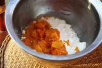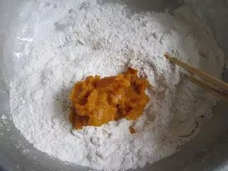 5.趁热把200克南瓜泥放入糯米粉里