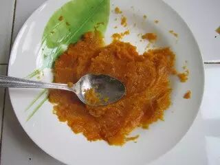 3.将南瓜用勺子碾成泥
