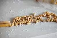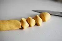 6.取另一块面团,揉成细长条,大小入小指般,用刀切成图中的小面团,用来做猪鼻子和耳朵