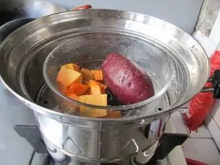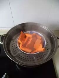 2.南瓜去皮切块入蒸锅蒸制25分钟