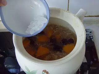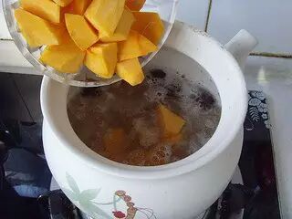 5.加入南瓜,红枣,转至小火慢炖20分钟
