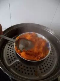 3.蒸好的南瓜用勺子压成南瓜泥