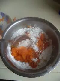 4.适量干酵母用温水化开,将南瓜泥,一般酵母水和牛奶倒入面粉中