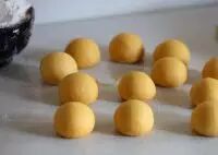 10.把南瓜面团分成40克左右一个的小面团,取一份包入15克的黑芝麻馅
