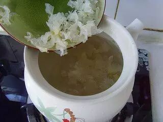 4.汤煲中加入适量的水,放入银耳,莲子,中火煮10分钟