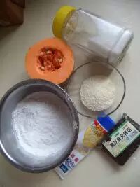 糯米粉200克,南瓜300克,白糖40克,炼乳30克,芝麻馅适量,椰蓉适量