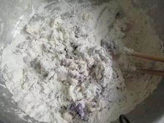 7.将紫薯泥和剩下的一半酵母水和牛奶倒入面粉中、
