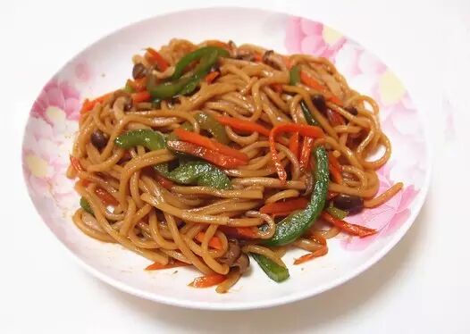 面条 120克、柿子椒 50克、猪肉(瘦) 80克、植物油 适量、食盐 5克、白糖 半小匙、蚝油 1大匙、水淀粉 1小匙、酱油 2小匙、葱 1段