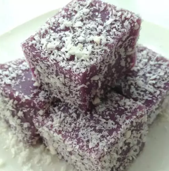 3、第二天取出,用小刀沿容器四周划-圈,再划成小方块,翻面扣在盘子里裹上椰蓉即可食用。