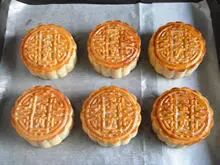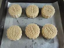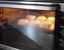19、将烤盘放入预热好的烤箱,200度,中层,上下火,烤焙25-30分钟,直到月饼表面变成棕红色。