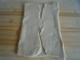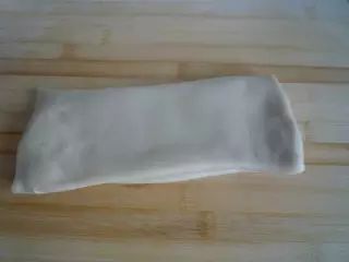 9、把叠好的面片,横放在案板上,再次擀成长方形面片。并再次4折。重复6-8这个过程,一共进行3-4次四折