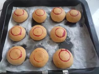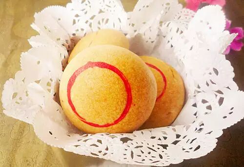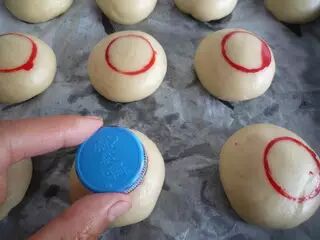 18、依次包好所有的月饼以后,用饮料瓶盖沾上少许红色食用色素,在月饼顶部印出一个红色的圆圈。