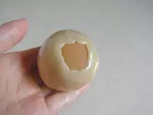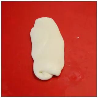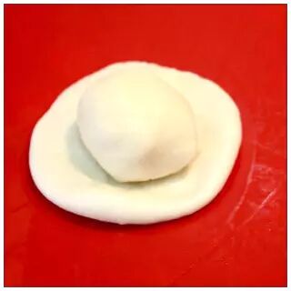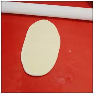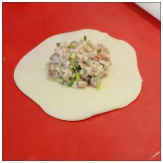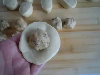 11、将一分包有蛋黄的馅料放在皮上,并把饼皮贴紧。