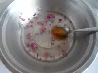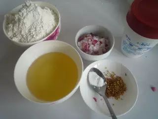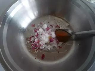 2、把白砂糖、麦芽糖、小苏打倒入碗里(女儿在一边帮忙,把玫瑰花揪碎,放在白糖里了,最后不得不又用面粉筛过了一遍)