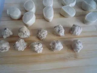 9、收口,搓圆,把蛋黄包在中心位置,依次包好其他。