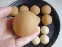 17、馅料包好后,自来红月饼就成型了。将包好的月饼收口朝下摆在烤盘上