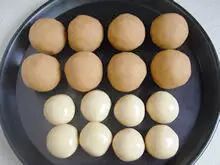 7、 将准备好的莲蓉馅和月饼皮分成需要的份数。一般来说,皮和馅的比例为2:8,如果刚开始学习,不擅长包月饼,也可以选择3:7,这样稍微好包一些。(拿 2:8为例,如果模具是50克的,就将皮分成10克每份,馅40克每份,模具是100克的,就将皮分成20克每份,馅80克每份,另外我因为包有蛋黄,把 蛋黄平均为每份15克,所以莲蓉馅就是65克)