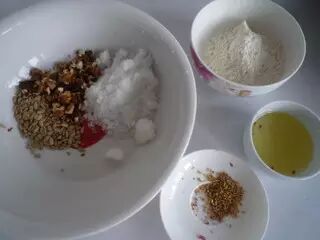 馅料:砂糖80克、香油28克、熟粉40克、干桂花适量、冰糖10克、瓜子30克、桃仁30克