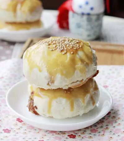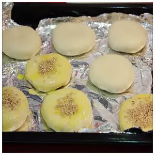 16、包好,收口向下,稍微按扁,可以刷一点蛋黄液,撒点芝麻,入烤箱烘焙。