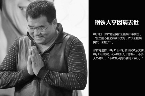 中国优秀民营企业家,天津荣程联合钢铁集团有限公司董事长,慈善家张祥青先生因突发心脏病医治无效,于2014年8月9日逝世,享年47岁。特此讣告。