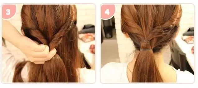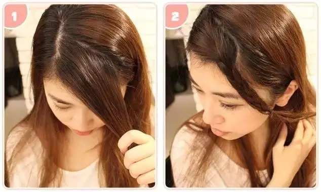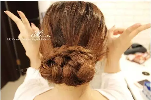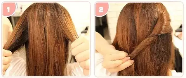把下方的头发分成2股绑成麻花辫,将辫子右边的往左边绕,左边的往右边绕