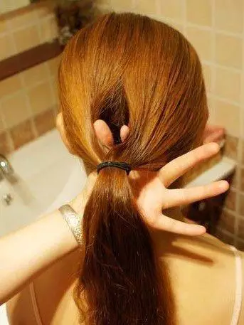 在橡皮筋上方拉出一个洞将马尾从洞中穿过,全部拉到底