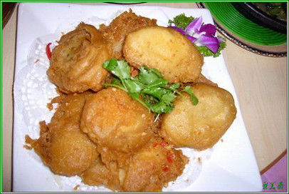 (3)素油入锅烧热,把拌好的茄料搓圆成饼状,入锅中炸2分钟捞起装盘即可。
