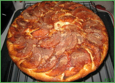 做法:将苹果洗净,每个切成六瓣或八瓣,去果核,整齐放入烤盘中,搅匀面粉、白糖、BakingPowder、盐和鸡蛋,均匀洒在苹果上,再将化好的黄油或人造黄油倒在面上,最后洒上Cinnamon(香料)。在华氏350度中烤一小时,或牙签插入拿出后没有粘连物即可。