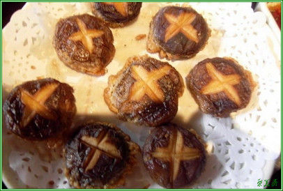 2、取粉团600克,分成20粒,把莲子茸与炸榄肉混合后分成20粒,用粉团分别包入莲茸馅,压扁成圆饼形,面上中心放原粒榄肉1粒(用水粘结,可防煎时脱落)。