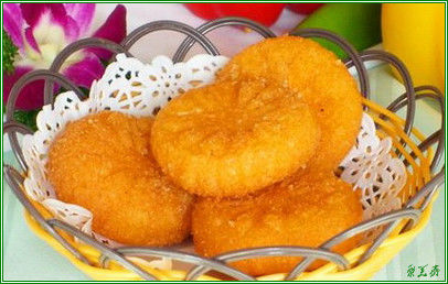 3、烧热油镬,放入适量生油,分2次饼放进镬内,煎至呈浅金黄色,再翻另一面,至两面同一色泽,起镬倒在笊篱里,滤去油分,上碟。
