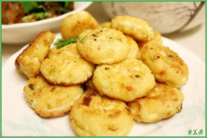取芋头洗净先隔水蒸熟,放凉,再用勺打开弄成泥备用,再将香葱切沫,火腿切沫一起入备好的芋头泥里,加入适量盐用手拌匀,做成一个个小饼,再用面粉加鸡蛋做成的糊糊上一层放油里一炸,表面金黄里面软而略有咸味,可口啊!