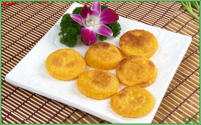 2.锅内加油,南瓜饼下油炸至金黄色即可。