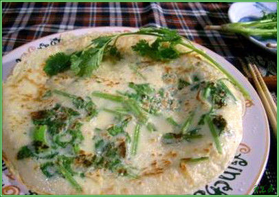 材料:面粉,鸡蛋,盐,葱,香菜,虾皮,水。