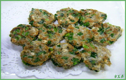 原料:面粉1斤,冷水6两,猪肉1斤,韭菜5两,香油、花生油、葱花、姜末、精盐、味精适量。