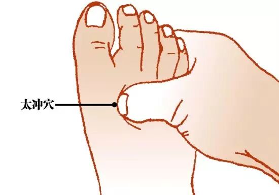 3. 按压肝脏排毒要穴。这是指太冲穴,位置在足背第一、二跖骨结合部之前的凹陷中。用拇指按揉3~5分钟,感觉轻微酸胀即可。不要用太大的力气,两只脚交替按压。