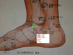 2. 按压脾脏排毒要穴。这是指商丘穴,位置在内踝前下方的凹陷中,用手指按揉该穴位,保持酸重感即可,每次3分钟左右,两脚交替做。