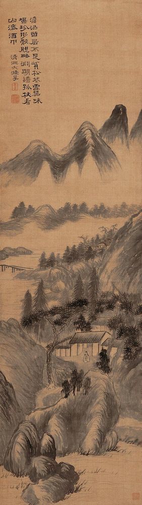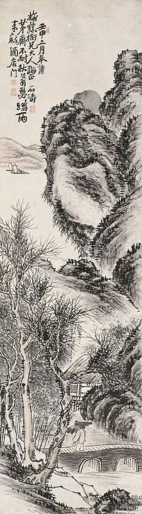 石涛(1641~约1707),俗姓朱,名若极,广西桂林人。明藩靖江王朱守谦后裔,朱亨嘉子。1645年后削发为僧,法名原济,一作元济。小字阿长,字石涛,号大涤子、小乘客、清湘遗人、瞎尊者、零丁老人、苦瓜和尚等。擅花卉、蔬果、兰竹,兼工人物,尤善山水。其画力主“搜尽奇峰打草稿”,一反当时仿古之风,其画构图新奇,笔墨雄健纵姿,淋漓酣畅,于气势豪放中寓静穆之,面目独具。书法工分隶,并擅诗文。与弘仁、髡残、朱耷合称“清初四高僧”。