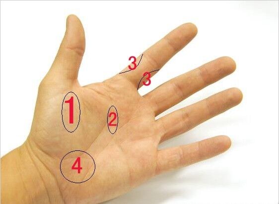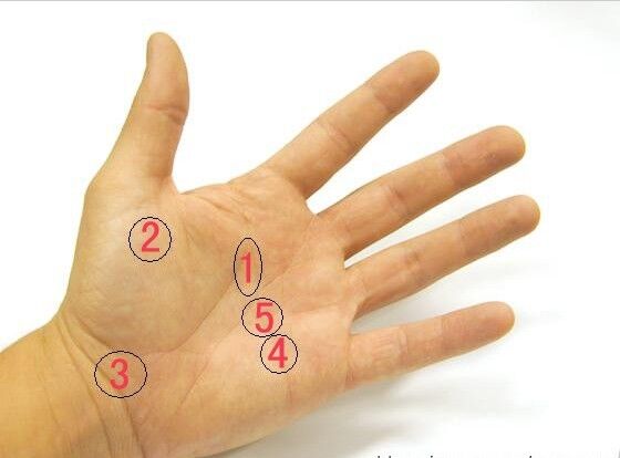 1、鱼际穴:大鱼际中间点,靠近骨头的位置。