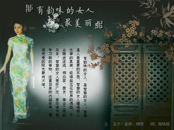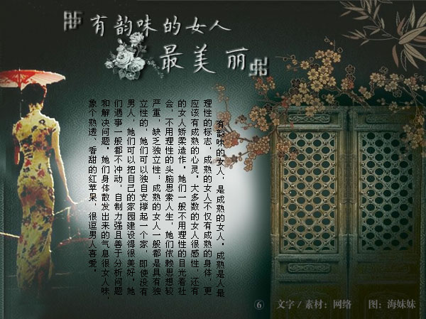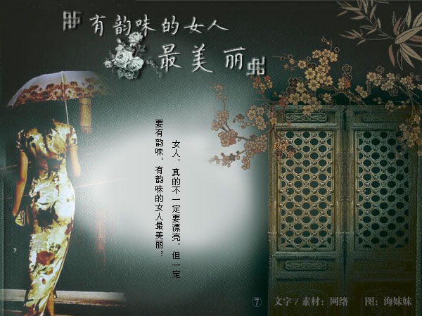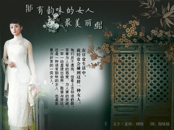 真正的风情女人没有任何刻意雕琢的痕迹。风情不是卖弄和表演,更不是矫柔造作的扭捏作态,风情是非常自然地流露。她们远离粗俗,而把气质和韵味祭为精神风骨。成为恋人时,她娇羞含情;成为妻子时,她魅力动人;成为母亲时,她温情脉脉;半老徐娘时,她仍然风韵犹存。