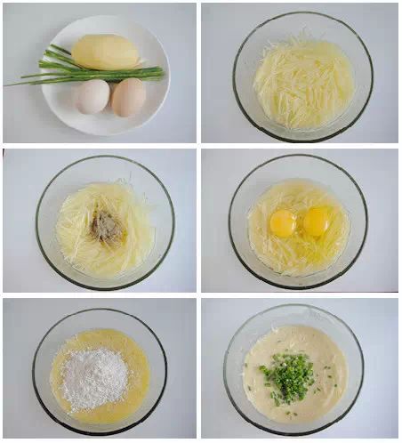 碗中的清水不要加多了,多了的话需要加入的面粉就多,那样煎出来的饼就不够香。如果立即操作,也可直接把土豆刨成丝,然后加入鸡蛋。摊饼之前,锅不要烧得太热,太热了,饼糊一下锅就熟,便不会流动,也就较难摊平。