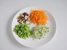 3:胡萝卜和黄瓜刨成很细的丝,西兰花和香菇切成细末。