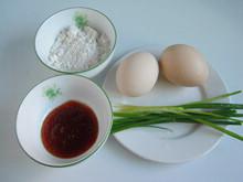 1:准备好鸡蛋、泰式辣酱、面粉、香葱。