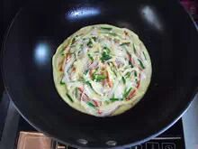 3:在蛋糊下锅40秒左右的时候,底部已经凝固了,此时便可以开始铺馅料,建议把火关了,以免动作不熟练,还没铺好,蛋饼已完全熟了。