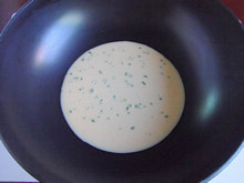 5:平底锅刷上一层薄油,倒入一半蛋液,铺平锅底,开小火煎制。