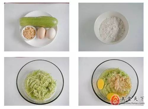 原料:西葫芦1个、鸡蛋2个、面粉适量、虾米1把