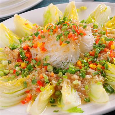 4、蒜和香葱分别切成末,粉丝用温水泡软