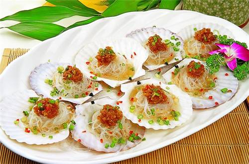 7、虾仁摆在粉丝上,再倒上蒜末,最后淋上少许料酒,锅内水烧开后上锅蒸3分钟左右,关火后再焖2分钟左右,出锅后淋上少许蒸鱼豉油,撒上葱花即可