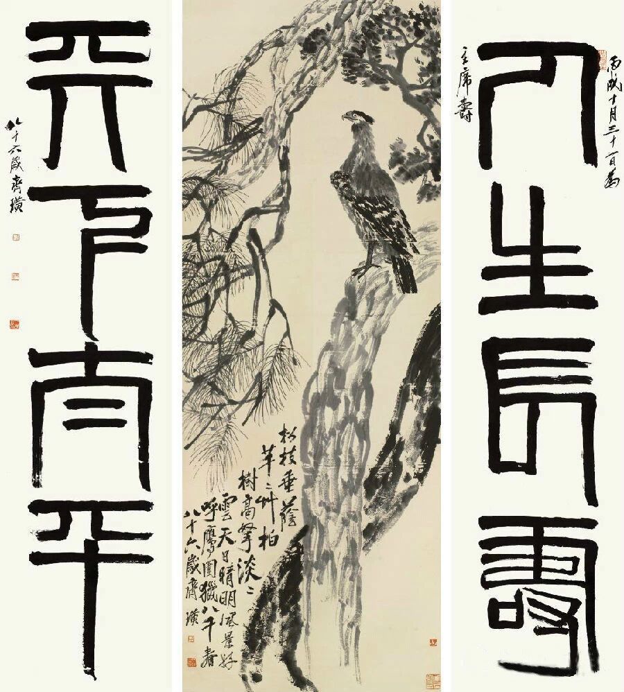 松鹰是齐白石最喜欢也是观赏者最熟悉的画题之一,“鹰”寓意“英雄”,刚健有力,而“松柏”则有长寿之喻。白石老人自题此画作于1946年,其时画家80多岁,正是艺术创作的成熟期,其创作欲望高昂,力作精品频出。正如其篆书对联“人生长寿,天下太平”的词句,画家所要表达的是对国家民族和平发展的美好祈望,对人间幸福、天下太平的美好祝愿。