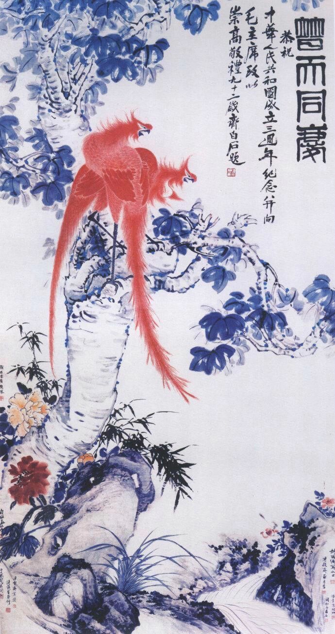题识:普天同庆。恭祝中华人民共和国成立三周年,并向毛主席致以崇高敬礼。九十二岁齐白石题。