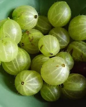 鹅莓又叫醋栗,果实都躲在茂密的绿叶底下,披着细毛,长在大量针刺的枝茎之间,采摘不易。
